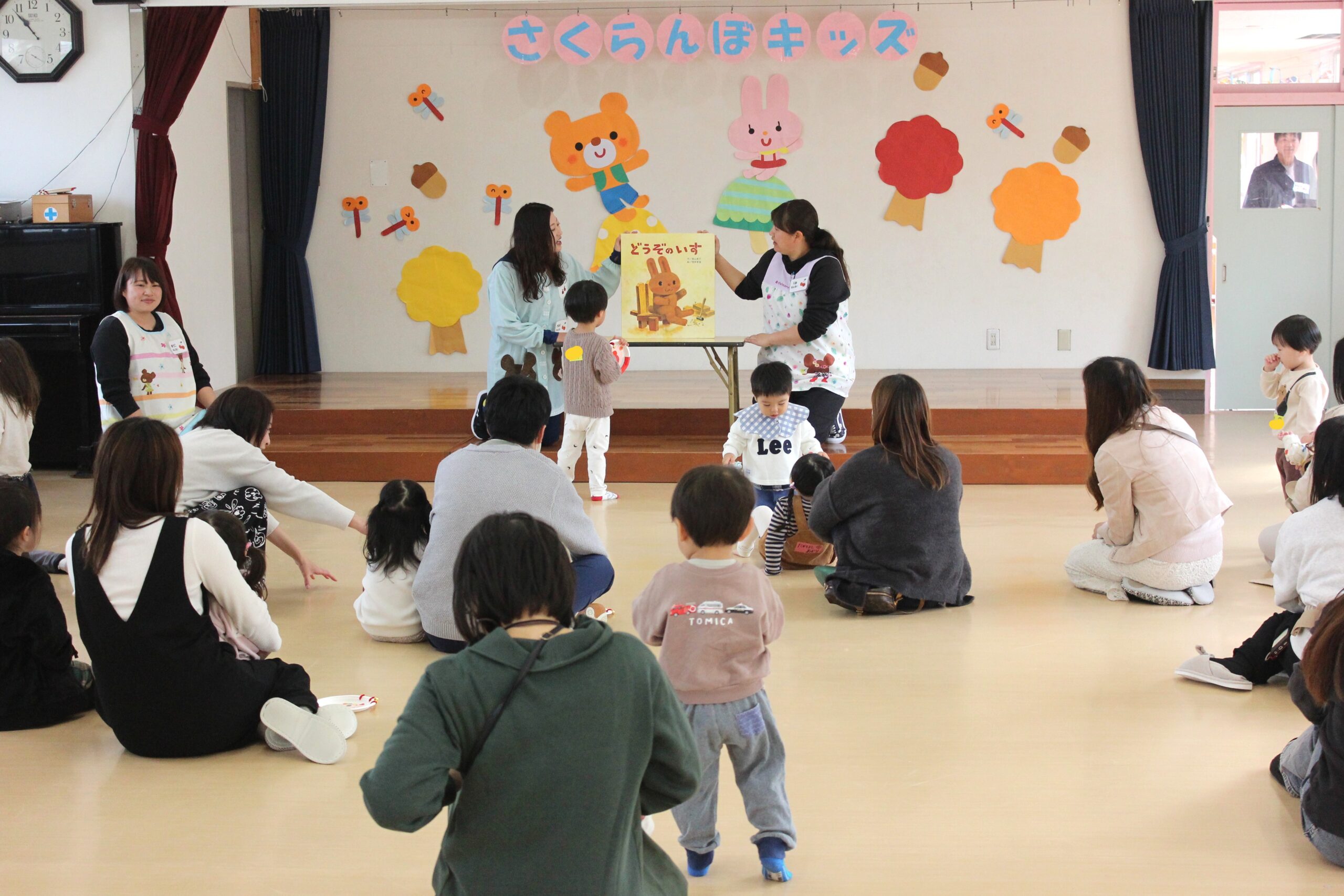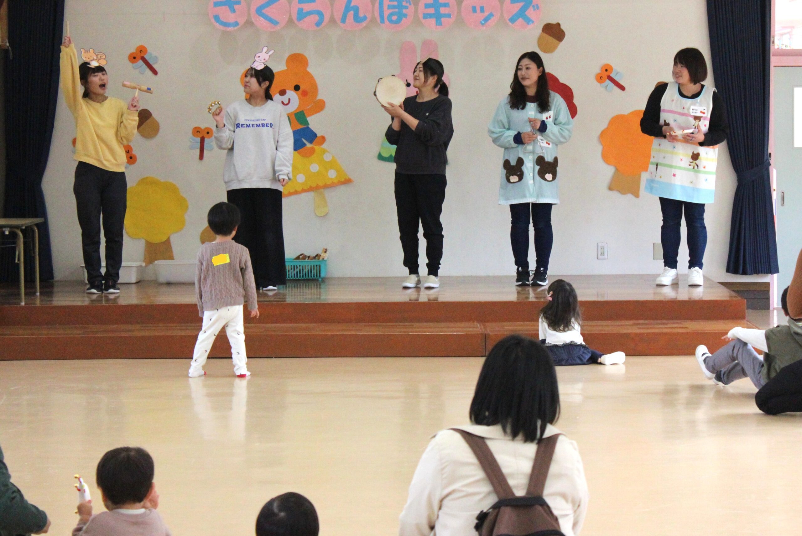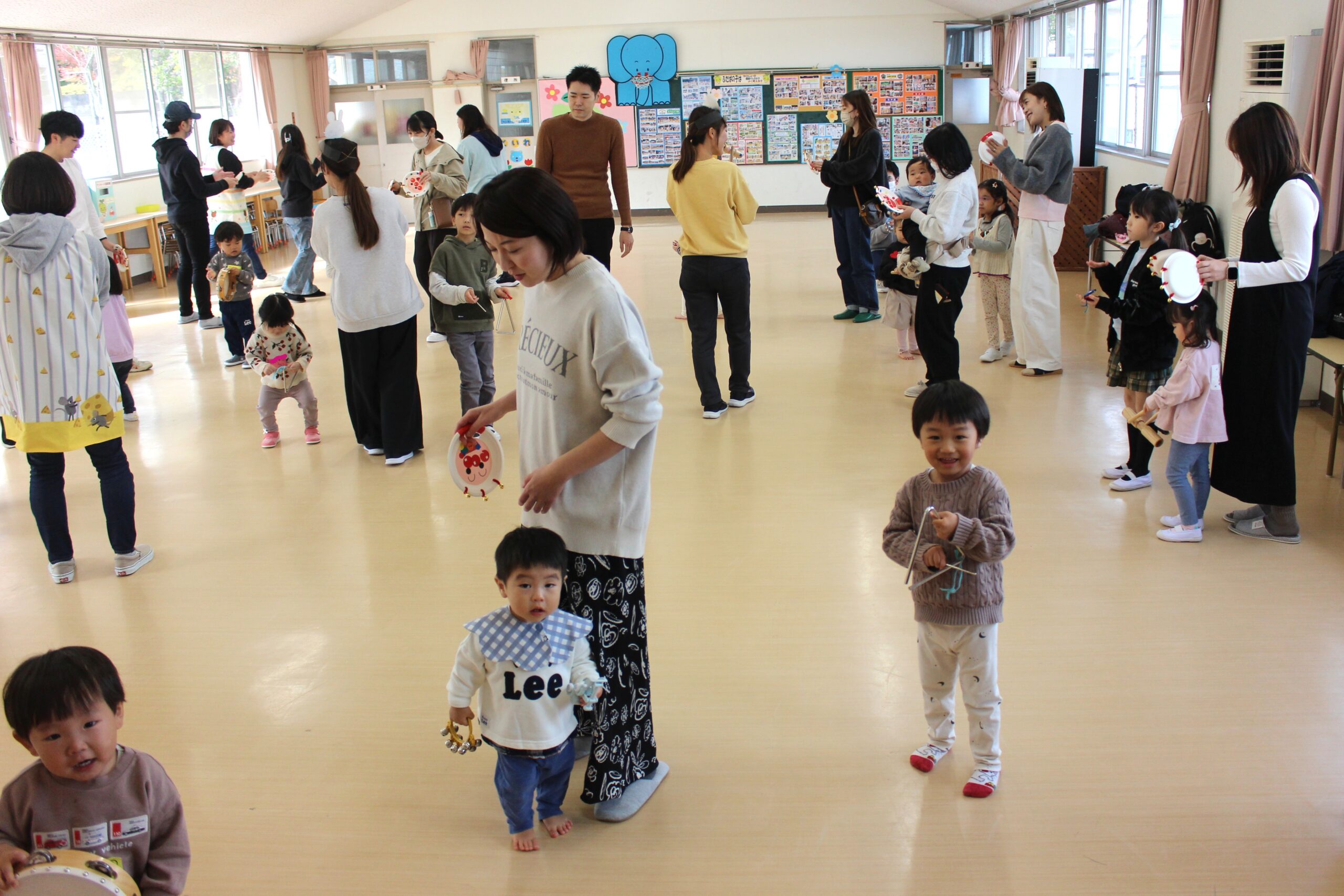11月8日(土)未就園児教室「さくらんぼキッズ」がありました。今回は「楽器あそび」 幼稚園にあるウッドブロックや鈴、トライアングルなど思い思いに楽器を選んで音を楽しみました。音楽に合わせて楽器を鳴らしながらお遊戯室内を散歩しました。いろんな楽器があって、それぞれにいろんな音が出るなんてステキだね。みんなが作ったアンパンマンのタンバリンもいい音が出てましたよ。