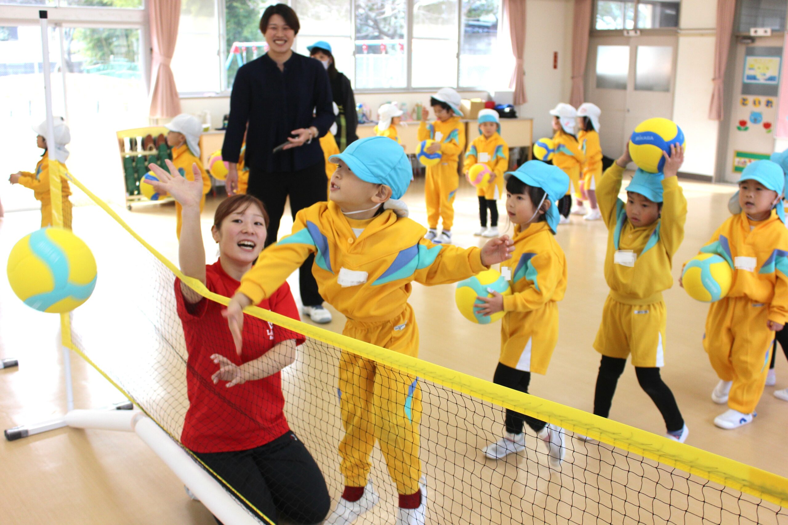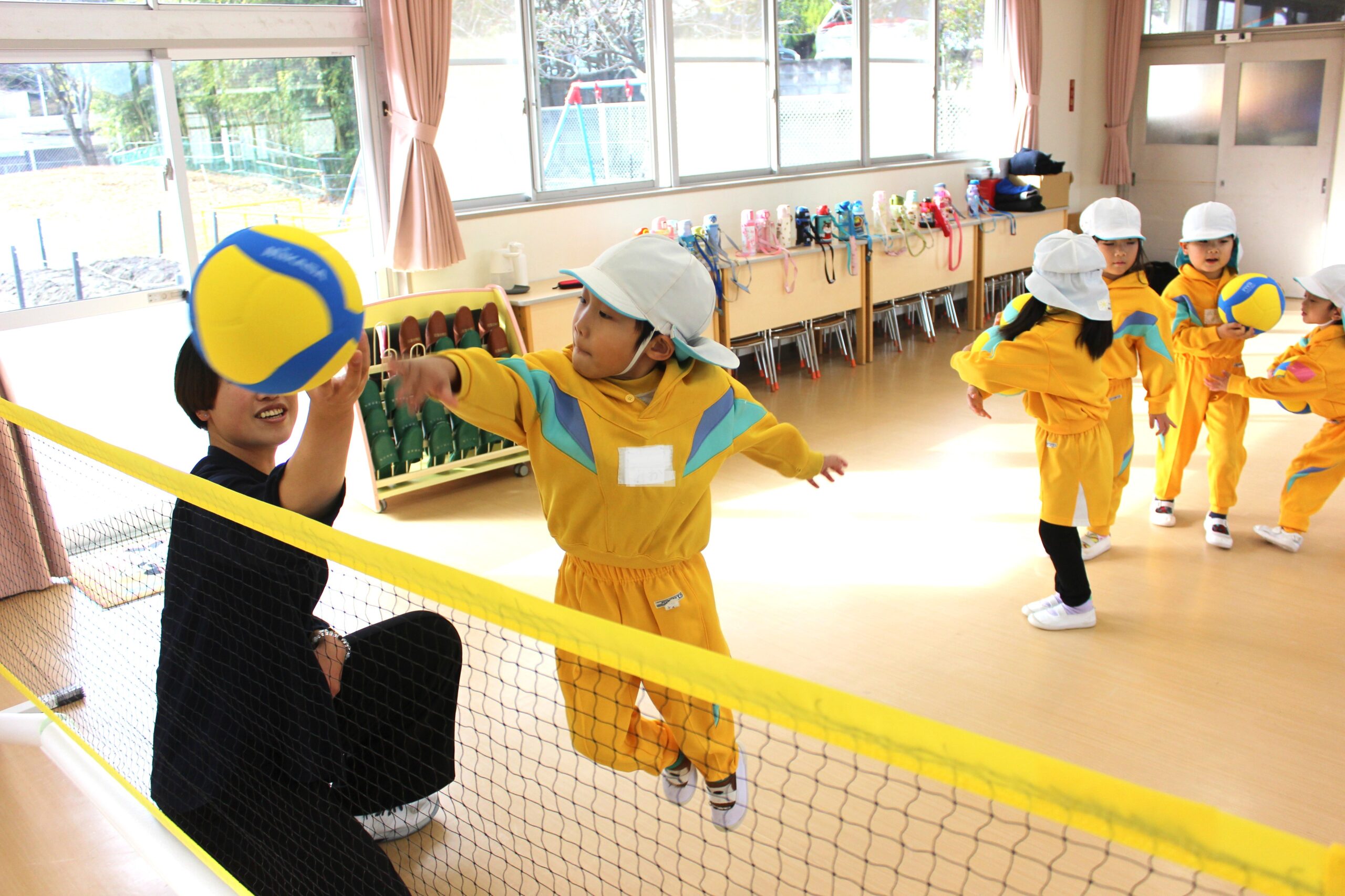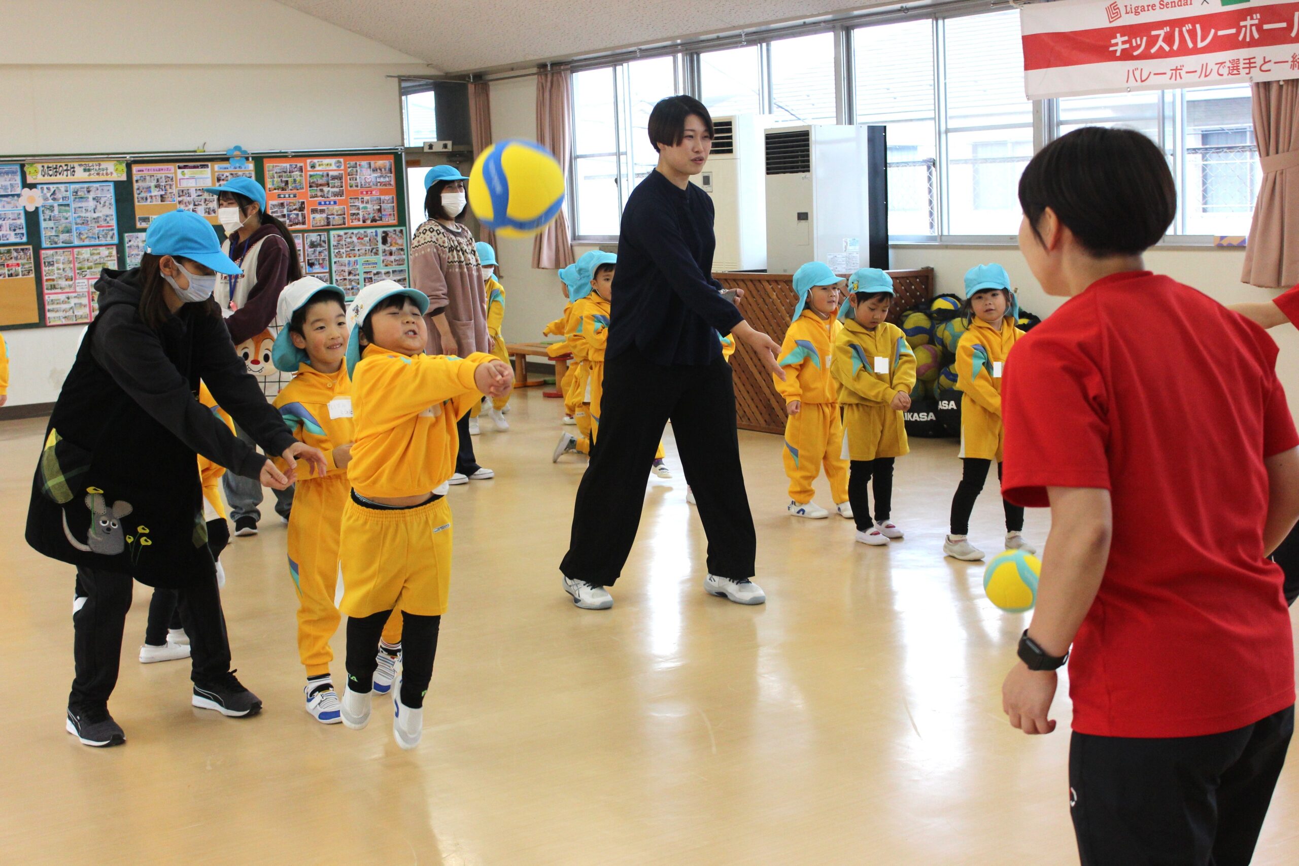 12月15日(月)仙台のプロバレーボールチーム「リガーレ仙台」の選手がやってきて、一緒にバレーボールを楽しみました。初めてだったけど、「アンダー」「オーバー」「スパイク」の言葉も覚えたよ。それ、バシッ!!