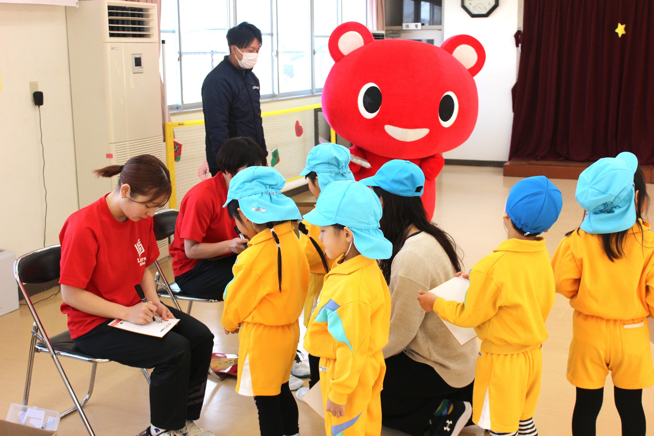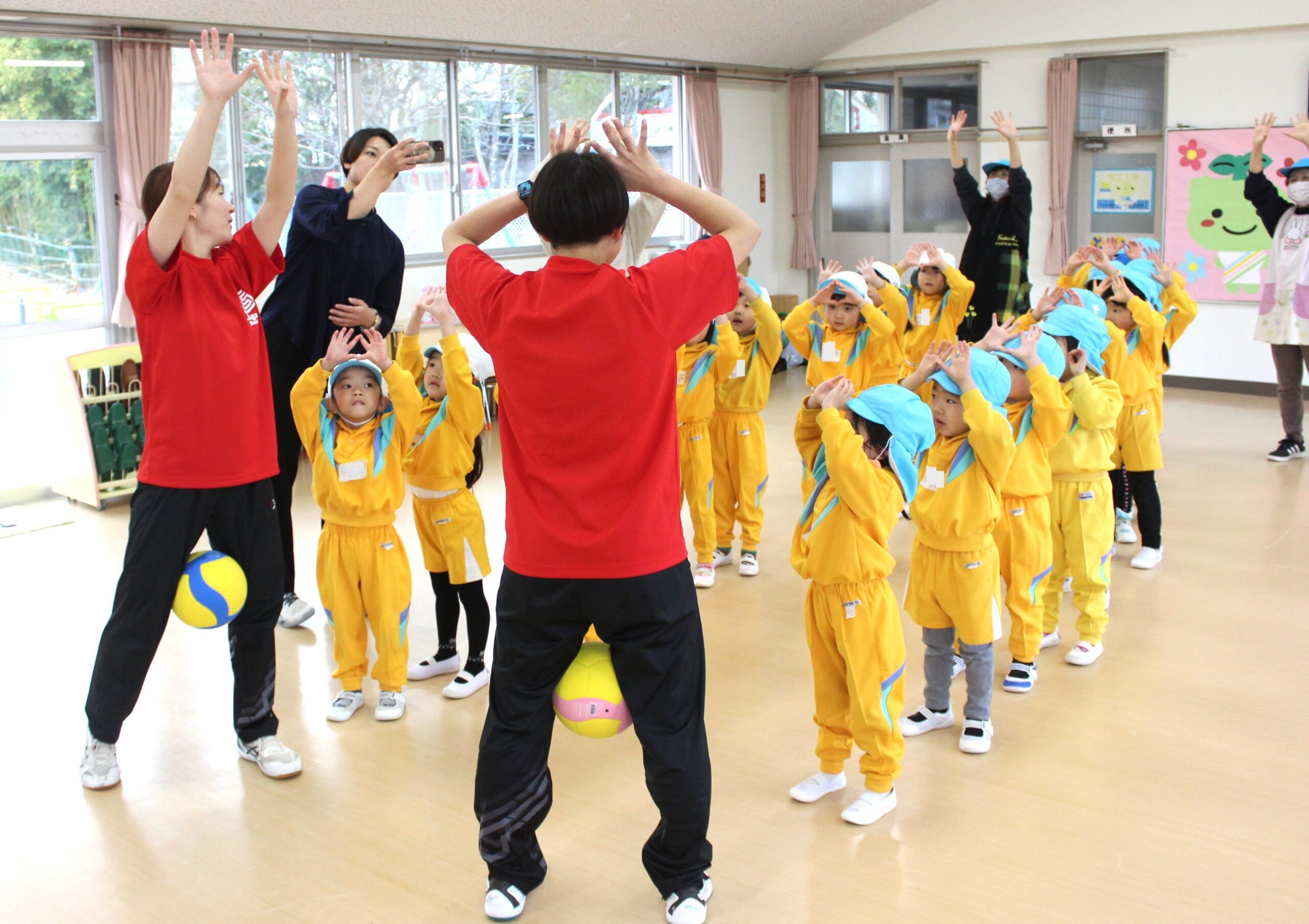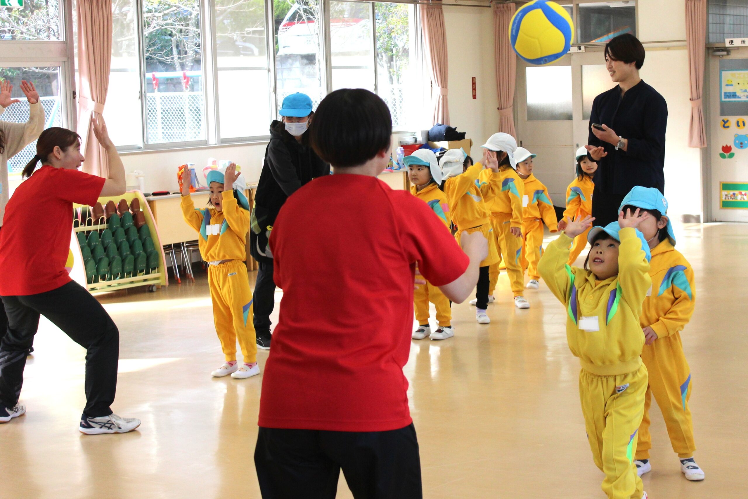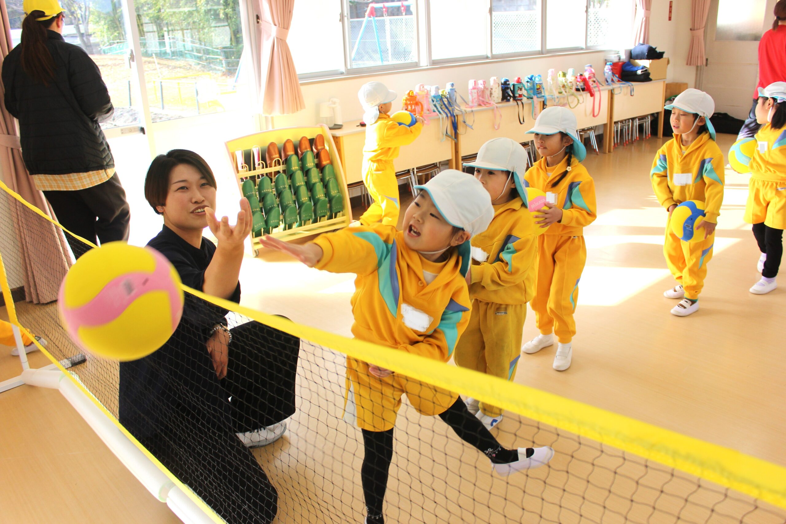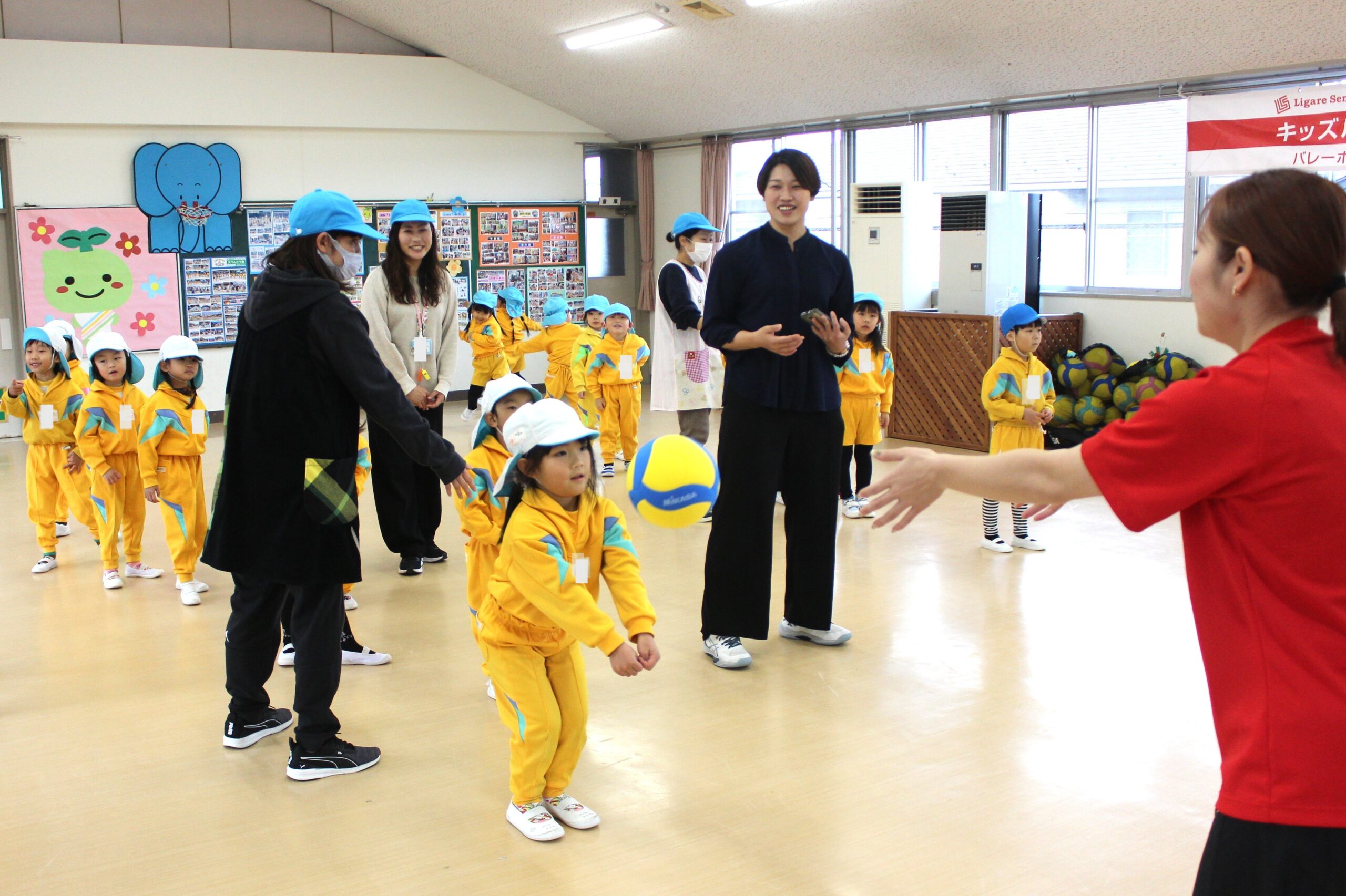 12月15日(月)仙台のプロバレーボールチーム「リガーレ仙台」の選手がやってきて、一緒にバレーボールを楽しみました。初めてだったけど、「アンダー」「オーバー」「スパイク」の言葉も覚えたよ。それ、バシッ!!