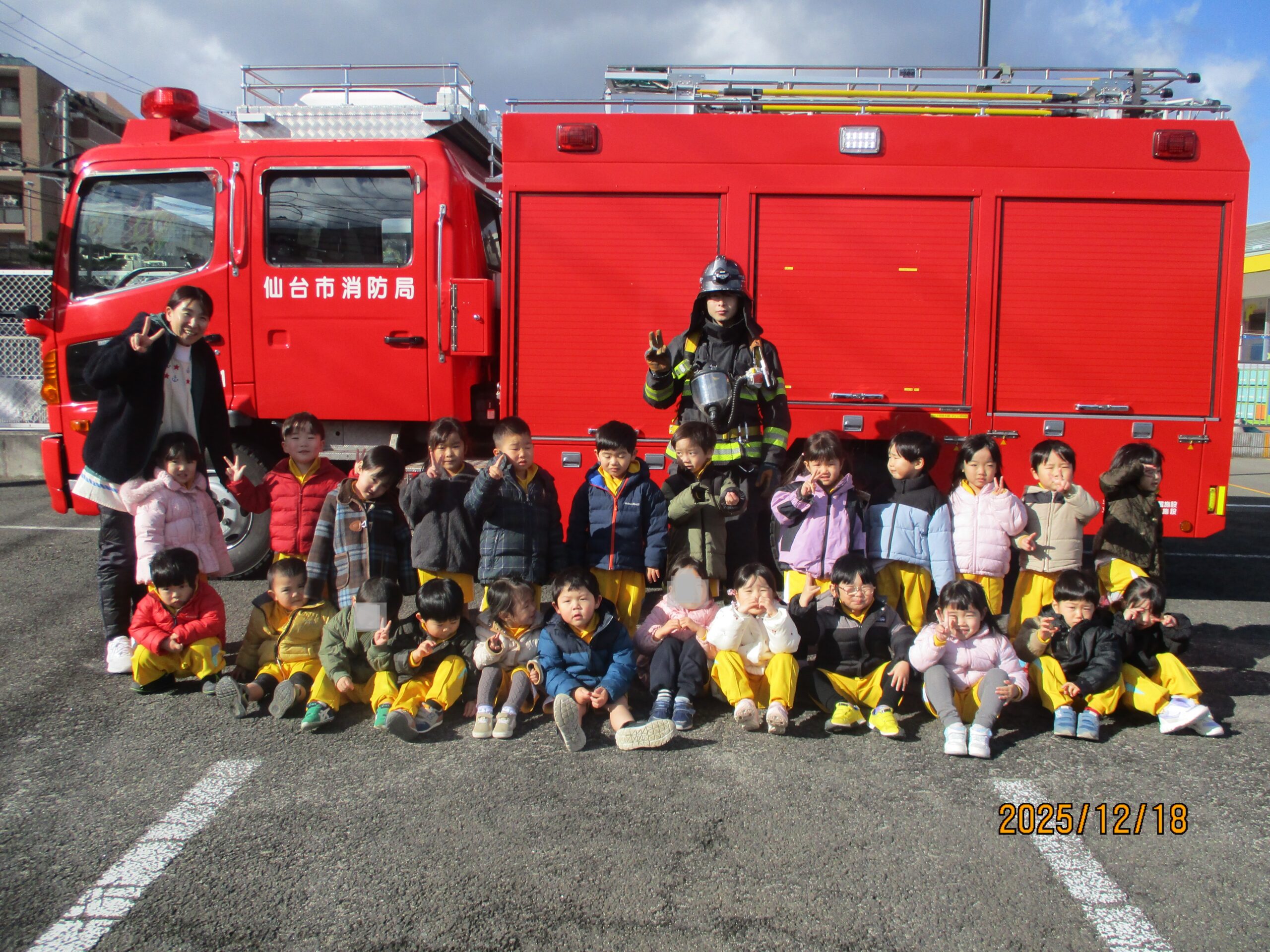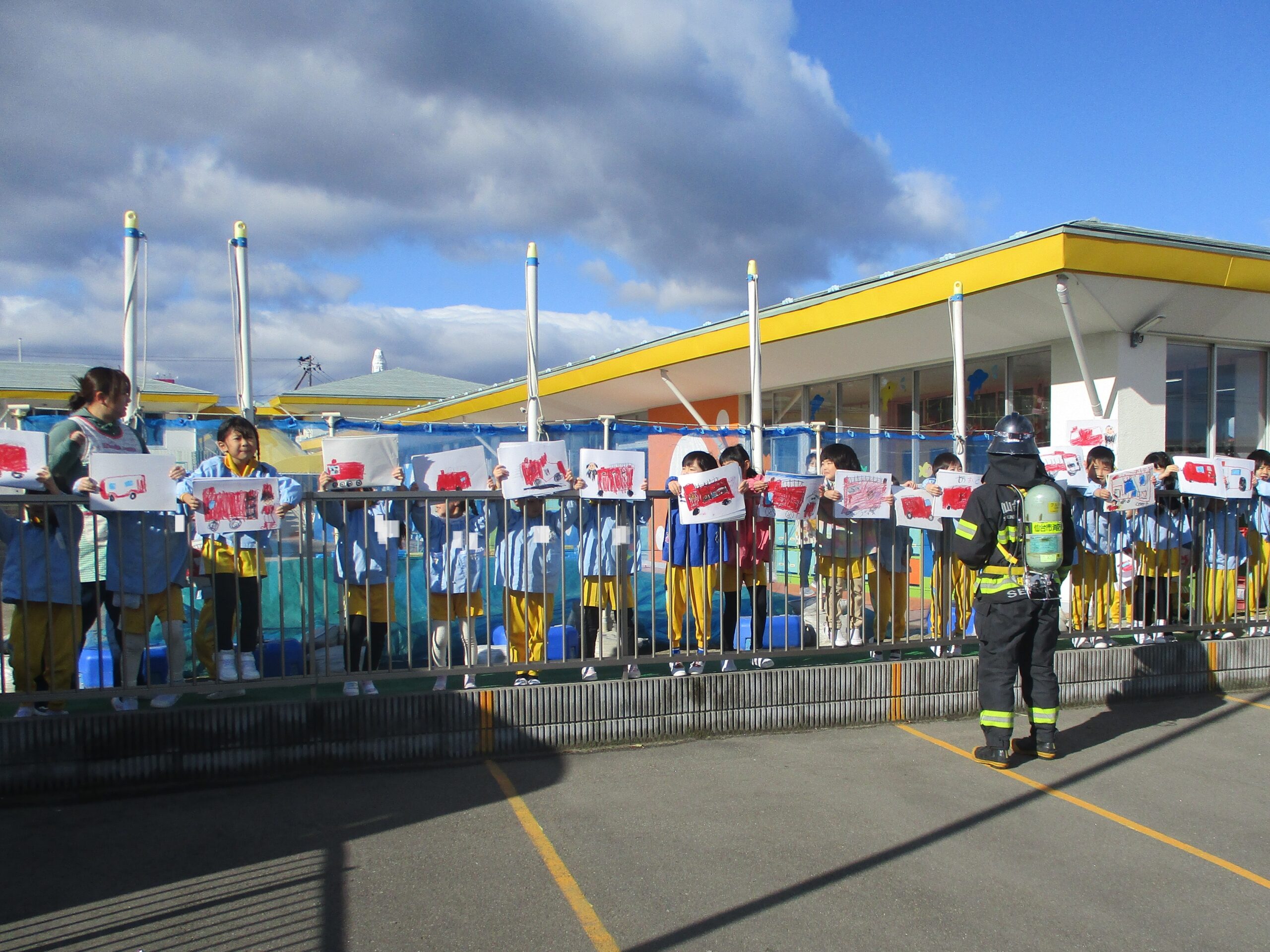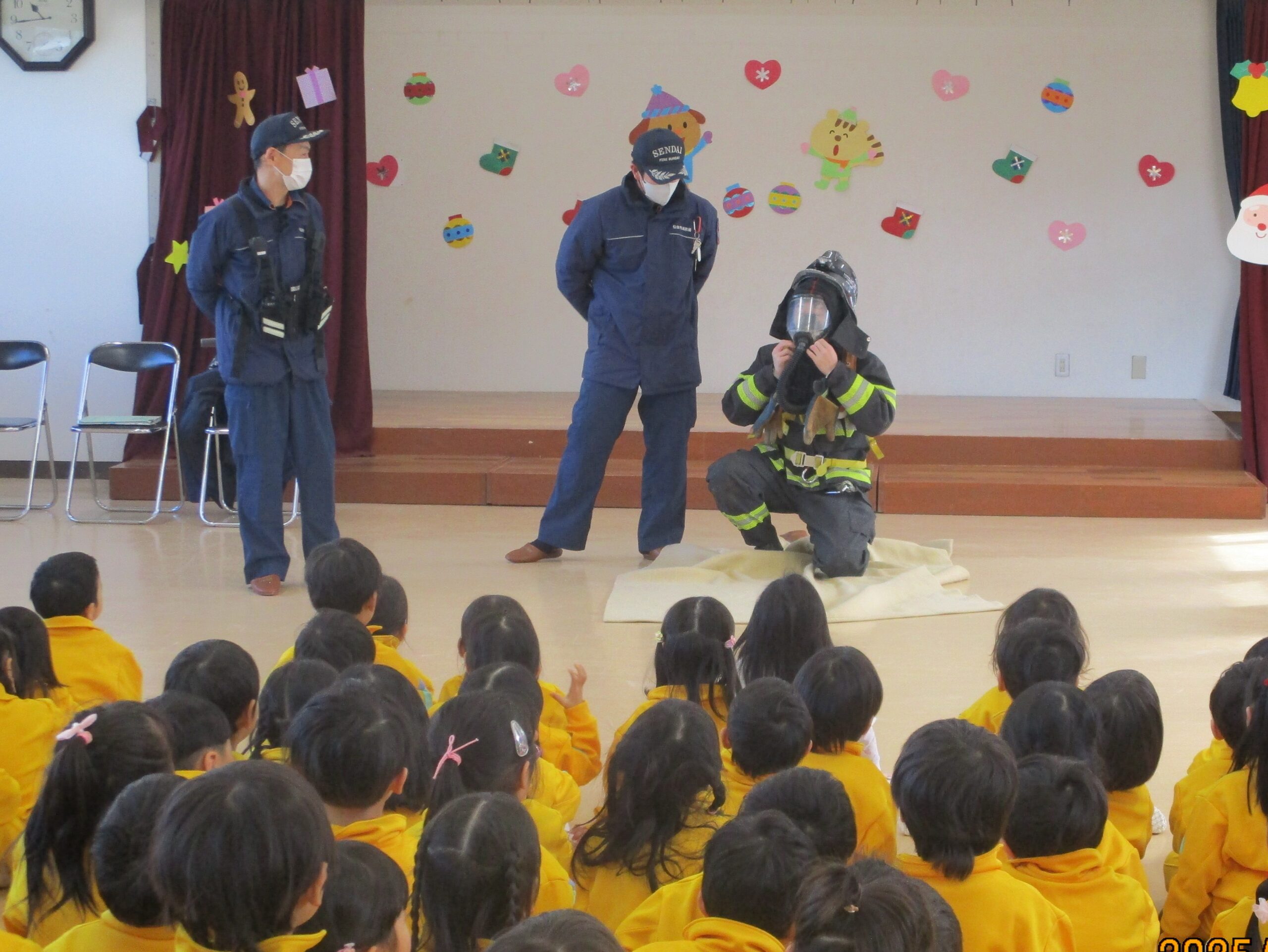12月18日(木)今年度8回目の避難訓練は、管理棟の湯沸かし室から出火したとの想定で行いました。みんなオハシモの約束をしっかり守って上手に避難できました。特に今回は先生たちの消火訓練を見学したり、消防士の方に防火服を素早く着用する様子や消防車も見せていただきました。みんな火の用心、しっかりがんばろうね!