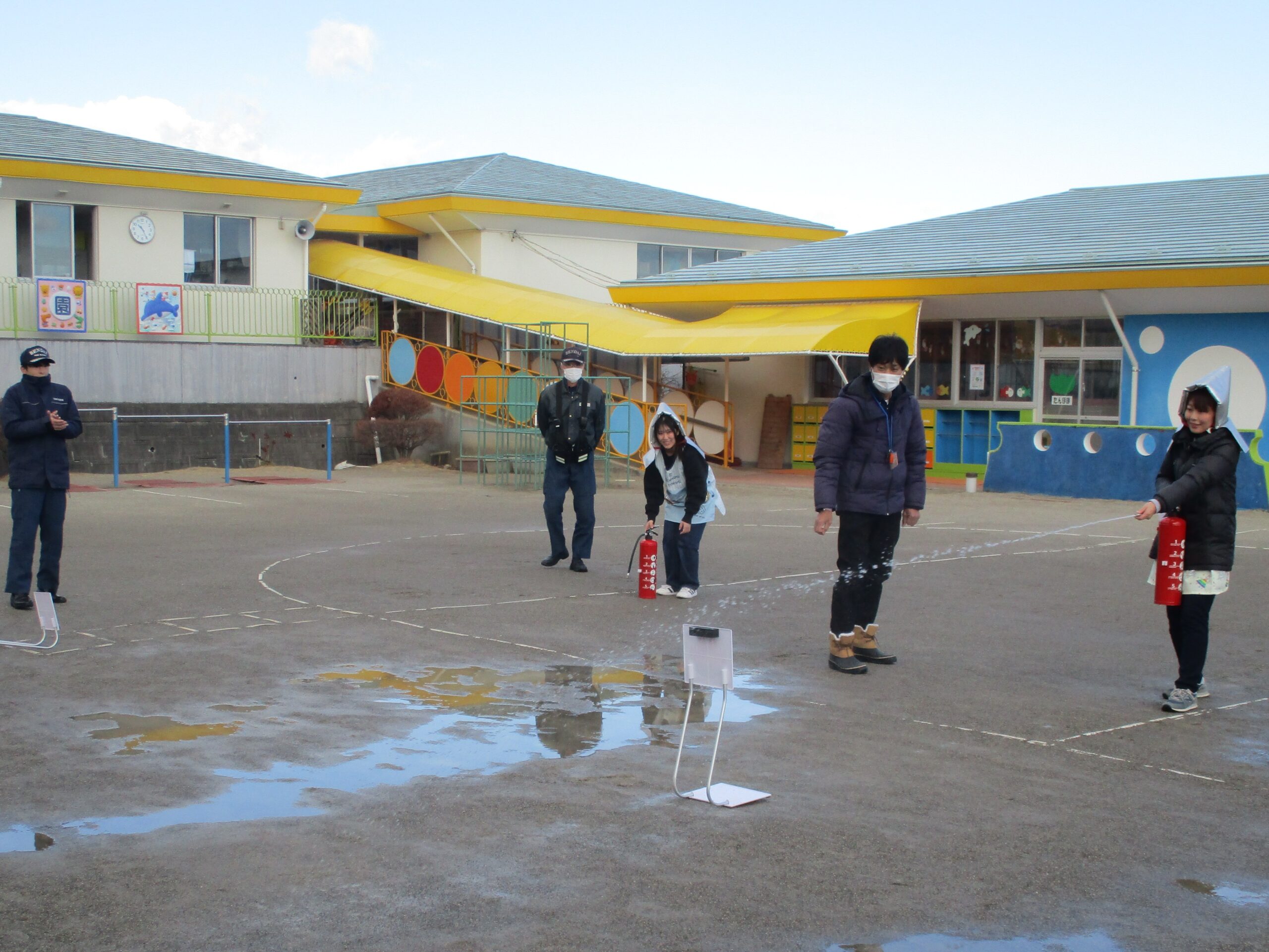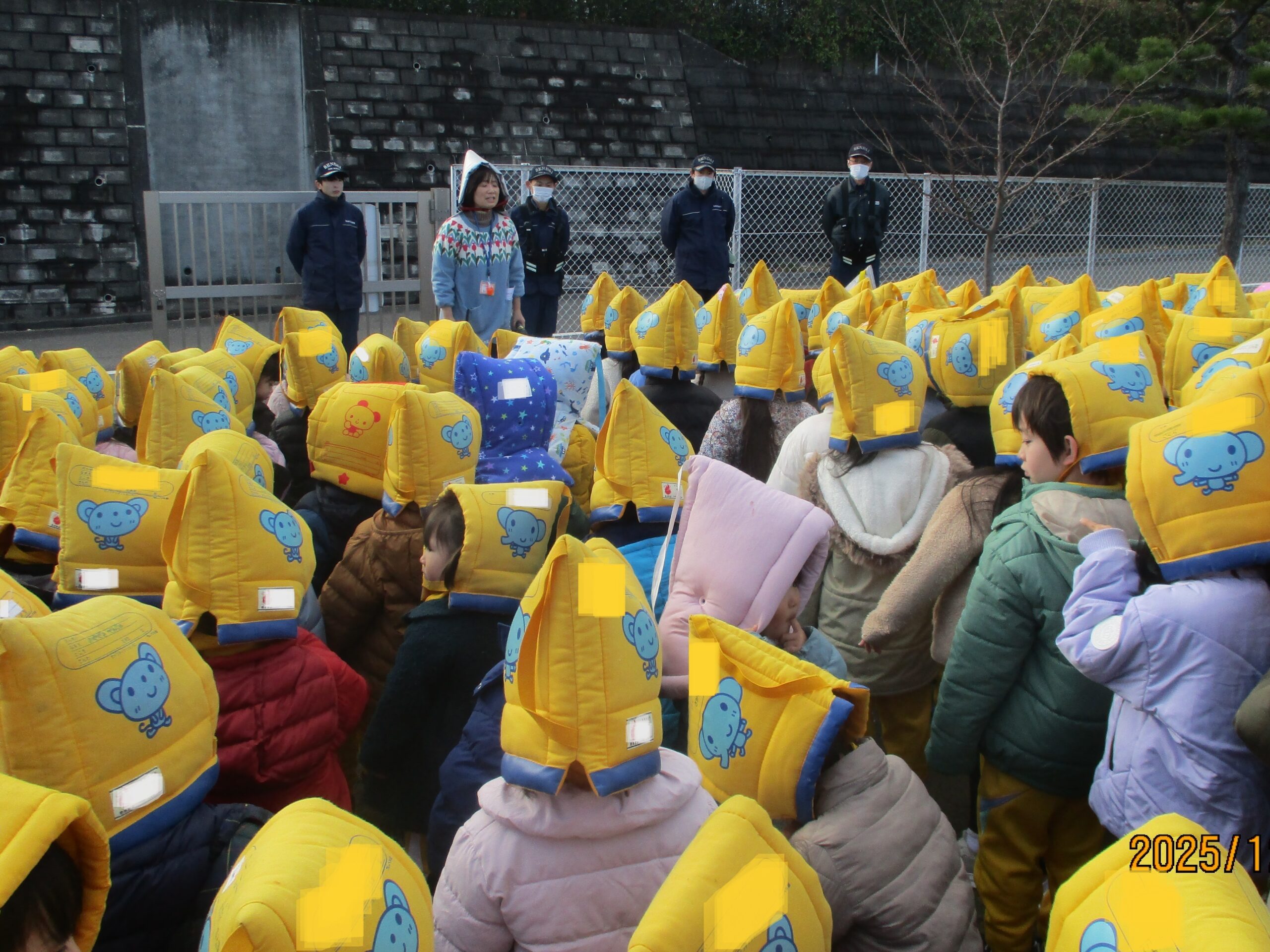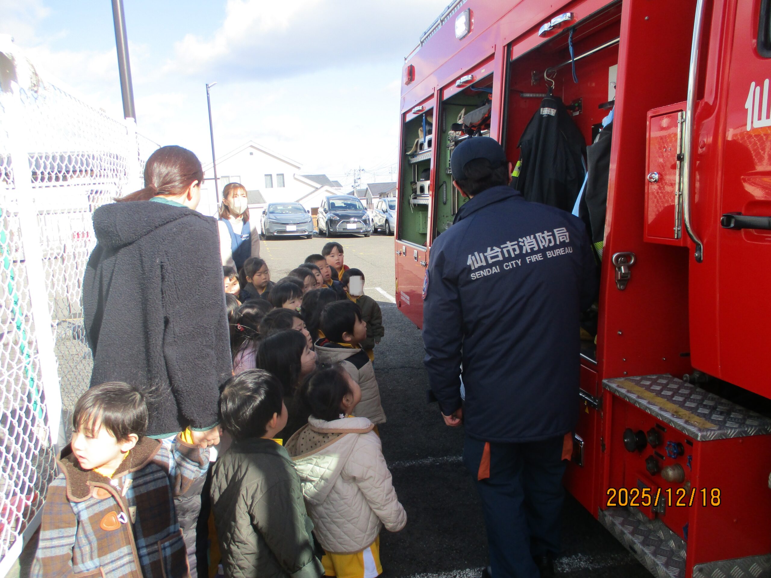 12月18日(木)今年度8回目の避難訓練は、管理棟の湯沸かし室から出火したとの想定で行いました。みんなオハシモの約束をしっかり守って上手に避難できました。特に今回は先生たちの消火訓練を見学したり、消防士の方に防火服を素早く着用する様子や消防車も見せていただきました。みんな火の用心、しっかりがんばろうね!