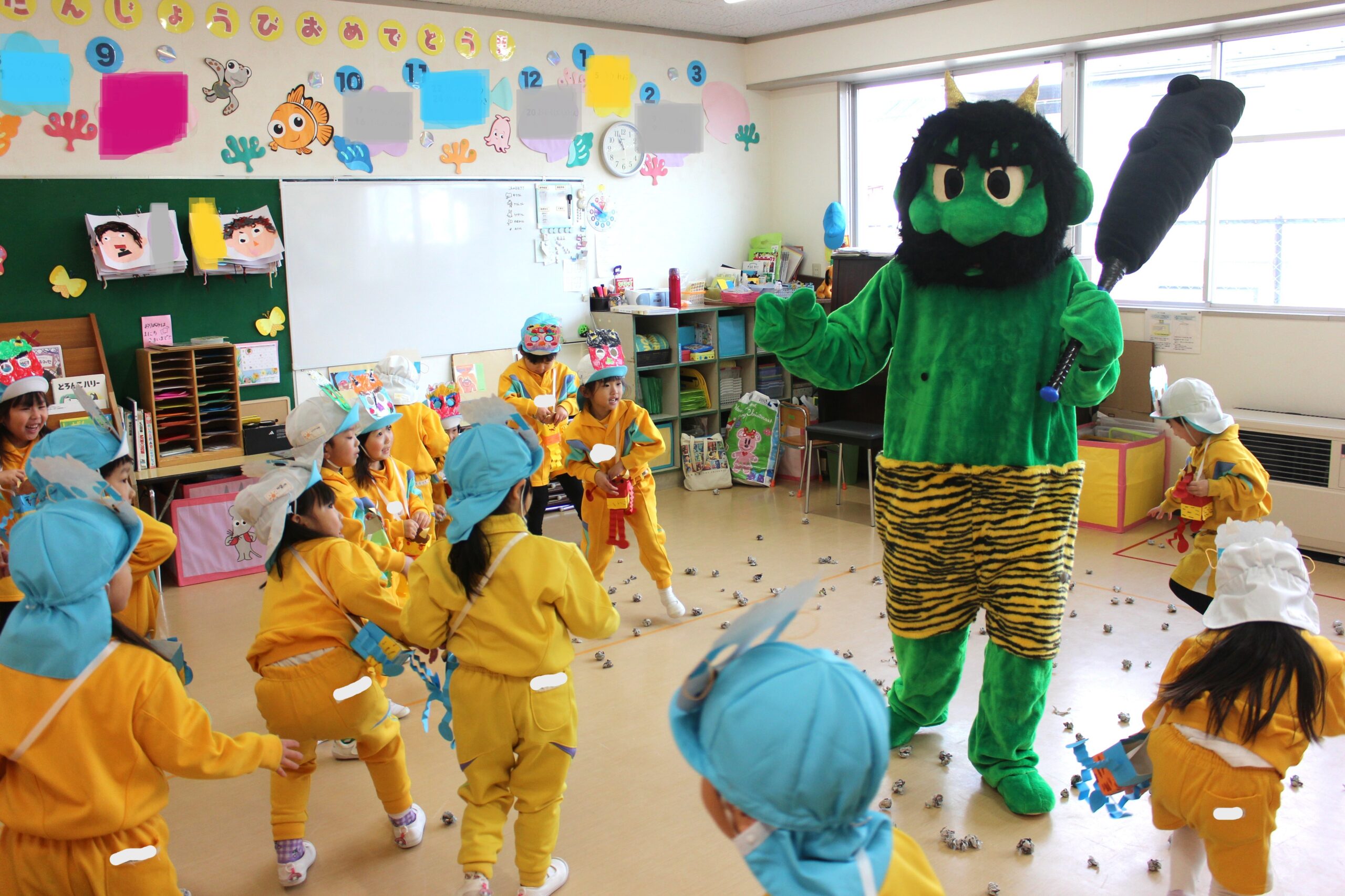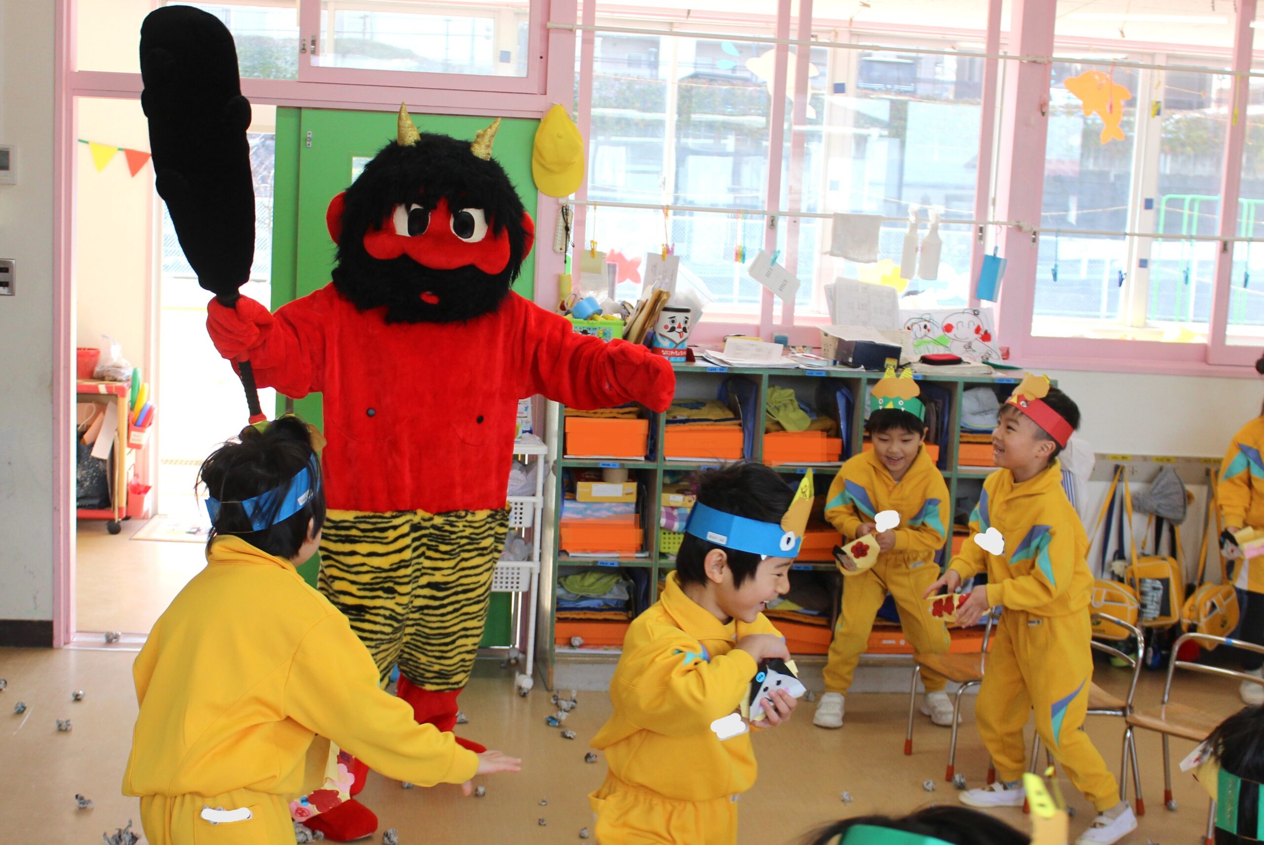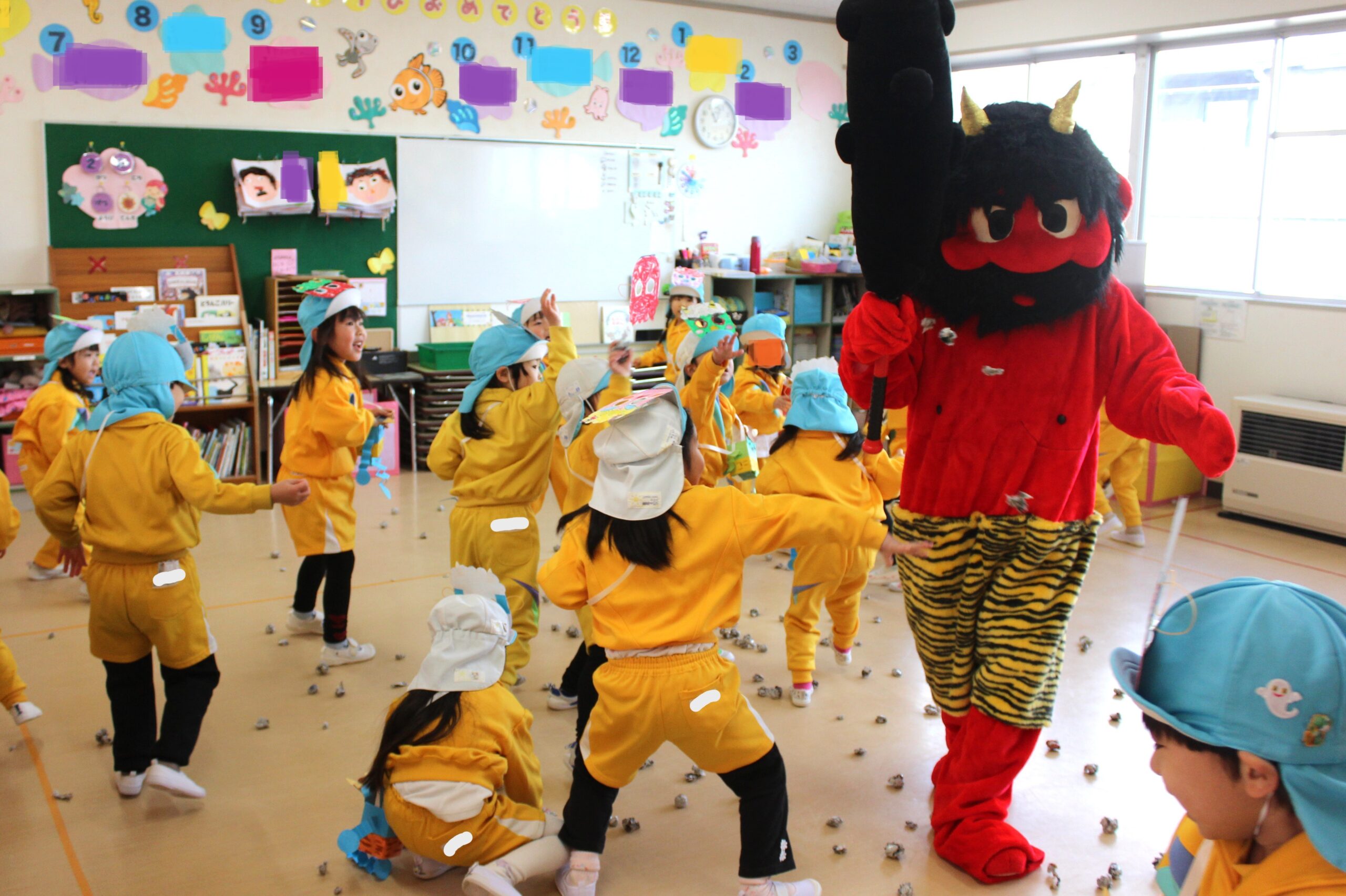 (年少さんの鬼はおなじみの補助の先生たち。でも年中・年長は本物の鬼が!)