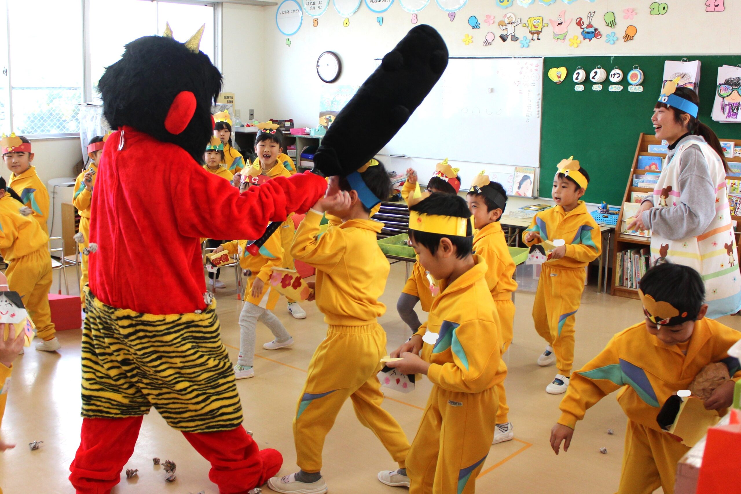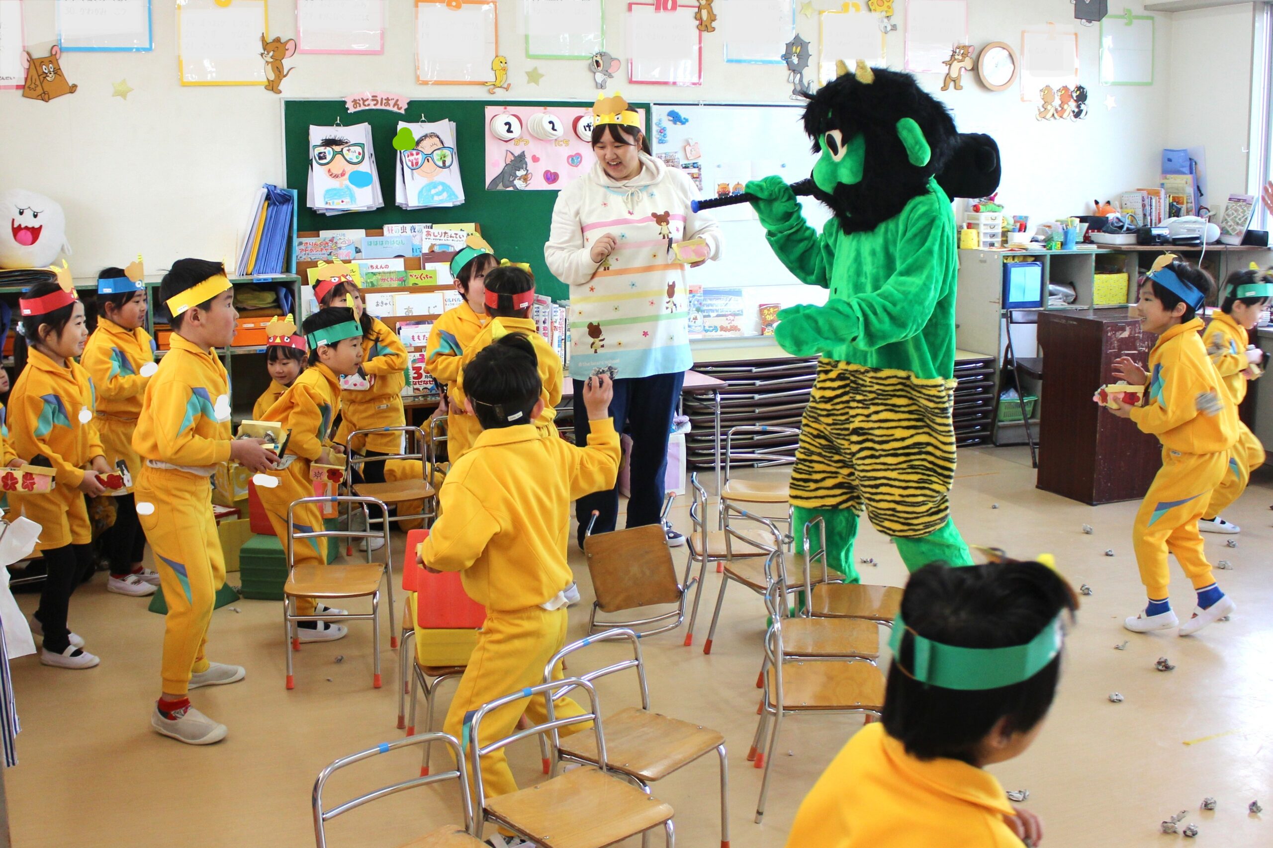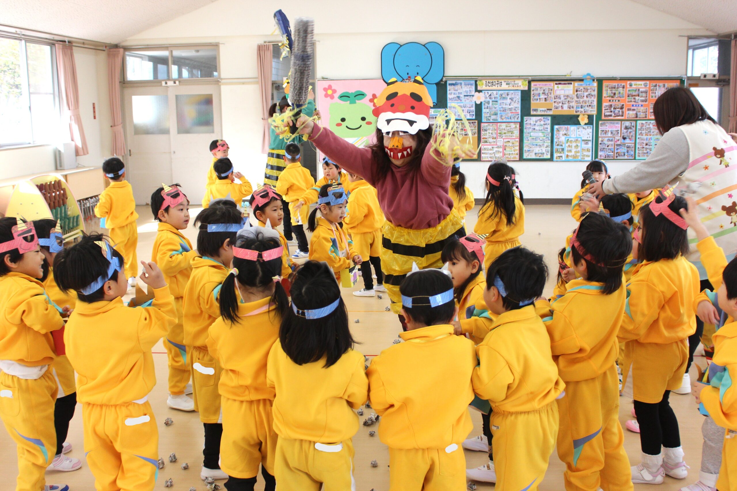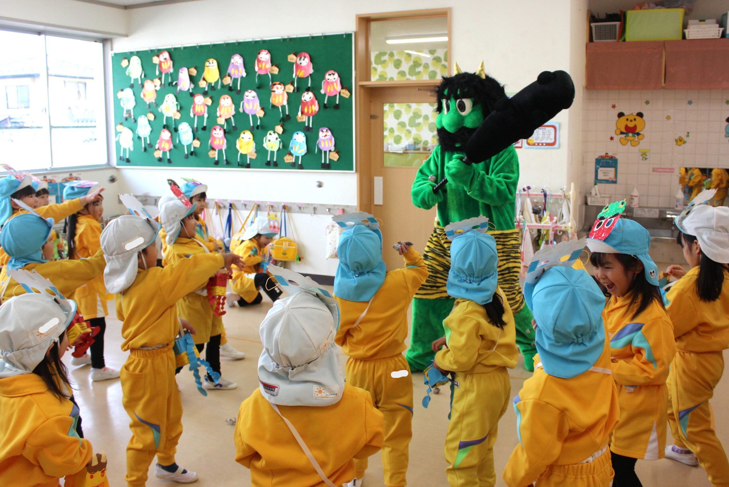 (年少さんの鬼はおなじみの補助の先生たち。でも年中・年長は本物の鬼が!)