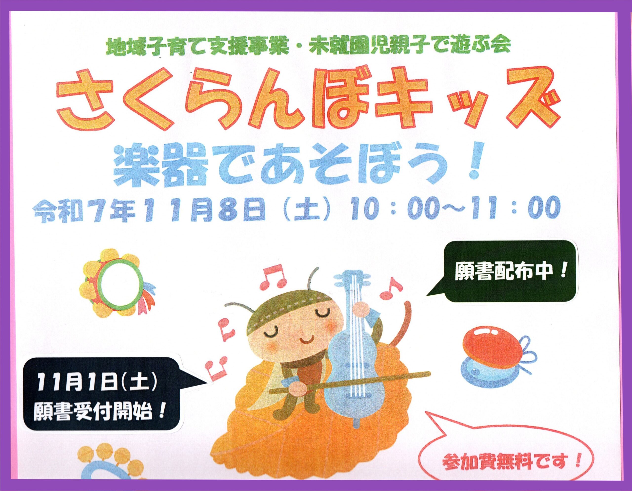 →11月8日(土)10時~11時 今回は「楽器であそぼう」だよ。